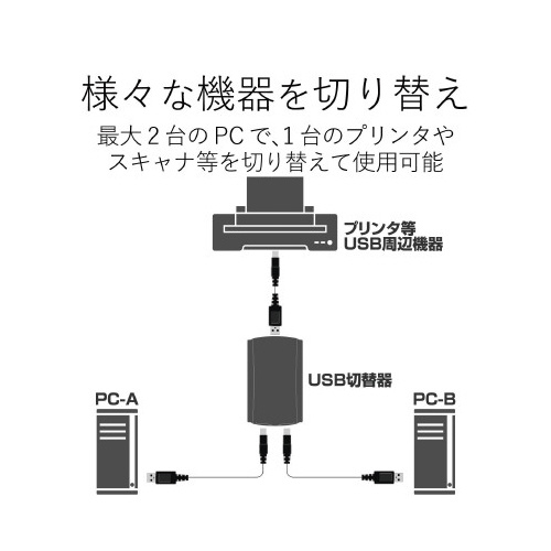 2台のパソコンで1台のUSBプリンタやストレージ機器を切り替えて使用できる切替器。USB2.0準拠。