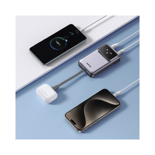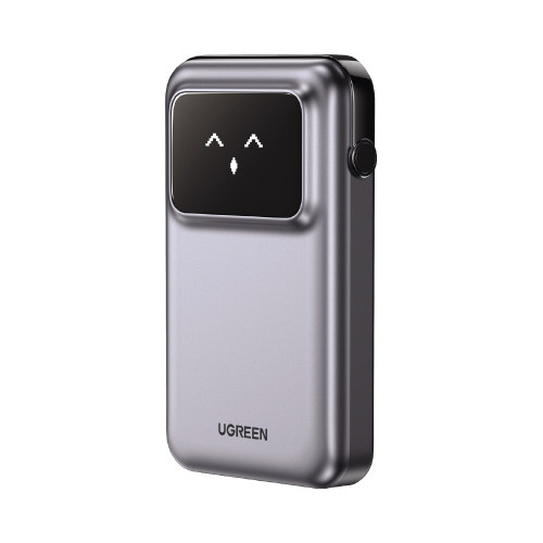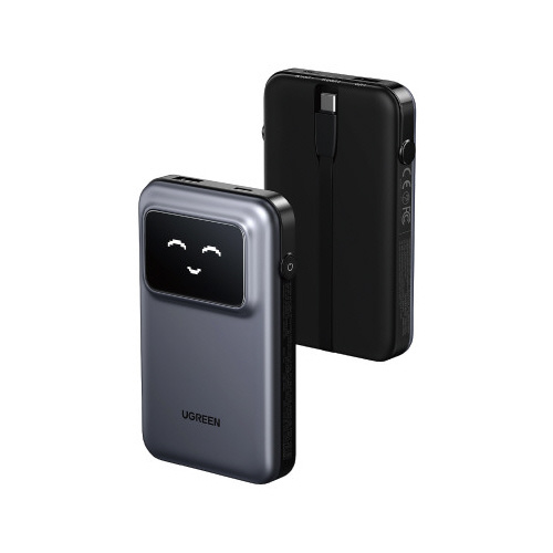 10000mAhケーブル内蔵型モバイルバッテリーは、スクリーンに表示されるロボットの表情で充電状況をお知らせします。本体に埋め込まれた30W対応USB-Cケーブルを、使う時だけ引き出すデザイン。