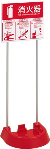 消火器をわかりやすく設置できます。コンパクトで高い安全性、あらゆるシーンに溶け込みます。底上げ式のベースは背面から水が抜け、ほこりなどがたまりにくい。アルマイト加工のポールは錆びにくく美麗。表示プレートは角が丸く、縁に補強が入っているため安全で割れにくい。日本語に加え、英語、中国語、韓国語の4ヵ国語を併記した使用方法は施設の国際化にも対応。小形で全高が低く、手摺などの下にも設置可能。(一部手摺を除く)
