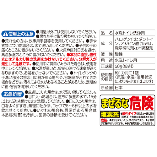 | 材質 | ハロゲン化ヒダントイン、アジピン酸(15%)、洗浄補助剤、pH調整剤 |