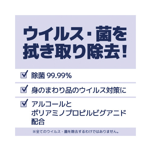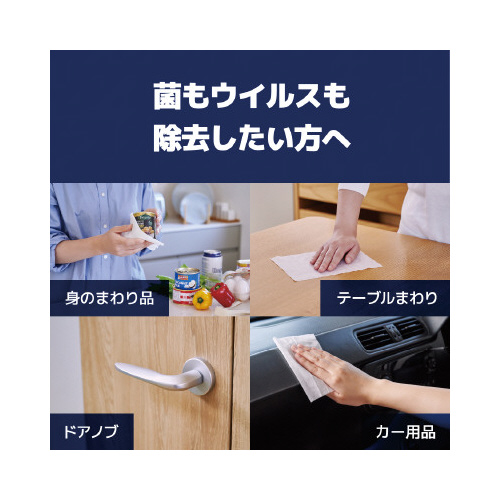 片手で使いやすいボックスタイプです。アルコールとポリアミノプロピルビグアニド配合しており、拭くだけで簡単にウイルス・菌を除去します。