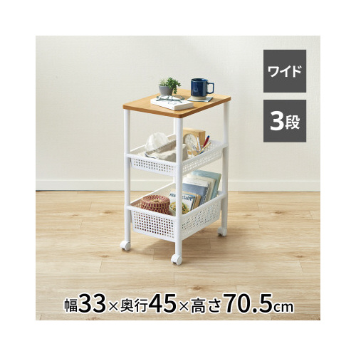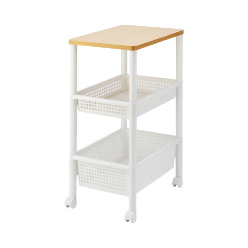 キッチンやリビングのちょっとした小物の収納にオススメの木製天板が付いたナチュラルな収納ワゴンです。キャスターが付いているので移動もラクラク。