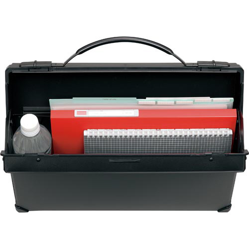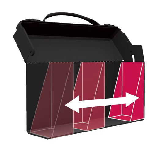 開口部が大きく左右に開くトップインタイプ。操作が簡単なスライドロック。位置を変えられる仕切りとコーナープロテクター付き。
