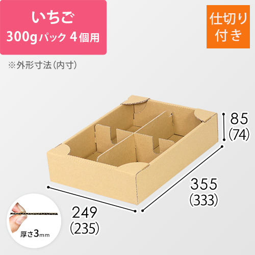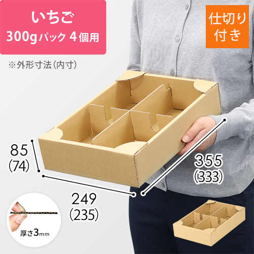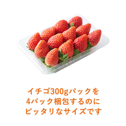 イチゴ300gパックを4パック入れられる、青果市場やスーパー、道の駅などの店頭で陳列するのにぴったりなダンボール箱。