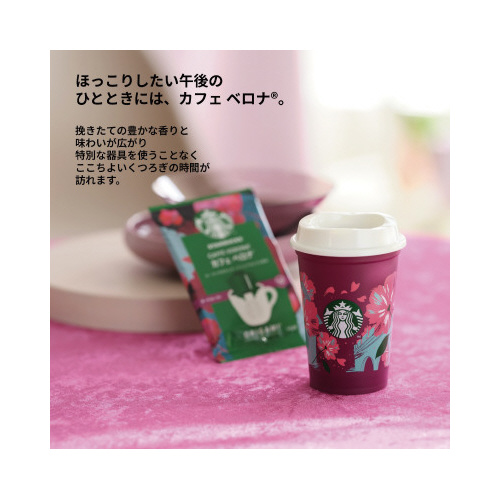 ヴェローナの街からインスピレーションを得た、ロマンチックな「カフェ ベロナ」のパッケージデザインのモチーフを活用した限定デザインのカップと、カフェ ベロナ1杯分がセットになった製品です。
