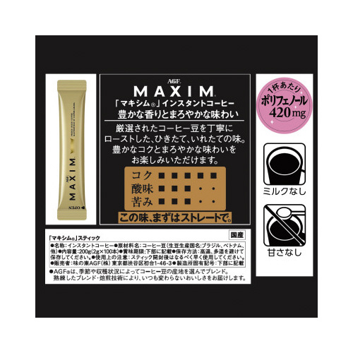 豊かな香りとまろやかな味わいの「マキシム」パーソナルタイプインスタントコーヒーの大容量サイズです。パッケージの金色の王冠は、インスタントコーヒーの王道でありたいという想いを込めています。