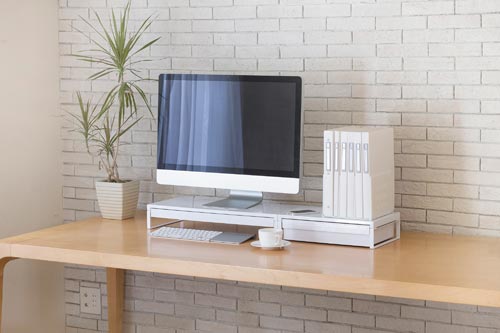 デスクの上をすっきり整理。机上台を使えば有効スペースがアップします。引き出し付きでさらに便利に!