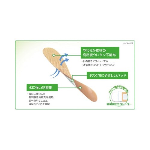 やわらか素材のウレタン不織布と、水に強い粘着剤を使用した救急絆創膏。指まわりや屈曲部にしっかりフィットするので、関節部も曲げやすくデスクでの作業中も快適。ムレも少なくふやけにくい商品です。