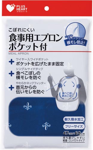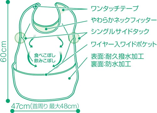 ポケットを広げたまま固定できるワイヤー入の食事用エプロンです。軽量・コンパクトタイプのため目立たず、外出時などの持ち運びにも便利です。オシャレなカラーを取り揃えました。