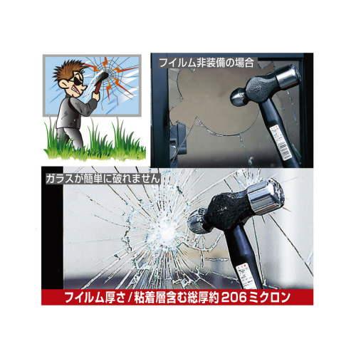 フイルムの厚さ188ミクロンの透明ガラス用防犯フイルム。サイズは40×90cmで2枚入、表面はスリ傷に強いハードコート処理済。