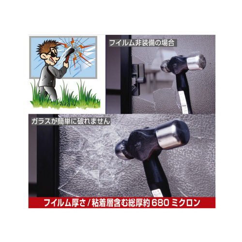 総厚680ミクロンの凹凸ガラス専用防犯フイルム。表面は室内側が透けて見えない様に加工済。抑止ステッカー2枚付、万が一の場合のお見舞保険(1回につき一律2万円)を支給致します。