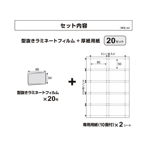 ラミネートフィルムと、フィルムにぴったりサイズの用紙がセットになった、カード・POP作成キットです。専用用紙に印刷してミシン目で切り離し、ラミネートするだけでカードやPOPが簡単に作成できます。