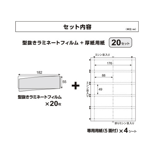 ラミネートフィルムと、フィルムにぴったりサイズの用紙がセットになった、カード・POP作成キットです。専用用紙に印刷してミシン目で切り離し、ラミネートするだけでカードやPOPが簡単に作成できます。