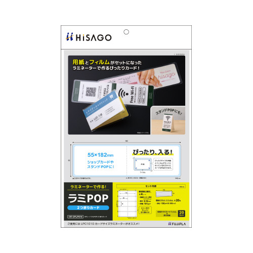 ラミネートフィルムと、フィルムにぴったりサイズの用紙がセットになった、カード・POP作成キットです。専用用紙に印刷してミシン目で切り離し、ラミネートするだけでカードやPOPが簡単に作成できます。