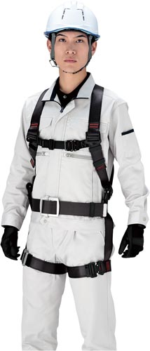 背中部分にメッシュで装着性が格段に向上した新規格適合の腿ベルト「水平タイプ」仕様の墜落制止用器具。