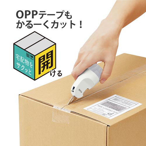 段ボールをサクッと開けて、宛名ラベルをイッキに隠す。段ボールのガムテープやOPPテープをサクッとカット。新開発インクで、つるつるした紙の印字も黒々としっかり隠せる。使いやすく置きやすい本体形状。