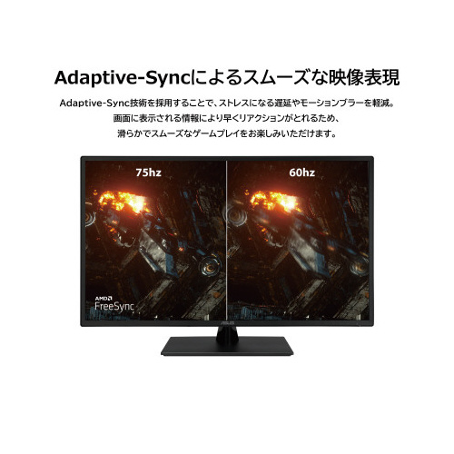 75HzのリフレッシュレートとAdaptive-Sync/FreeSync機能により、画面のカクつきやチラつき、フレームレートの低下を解消