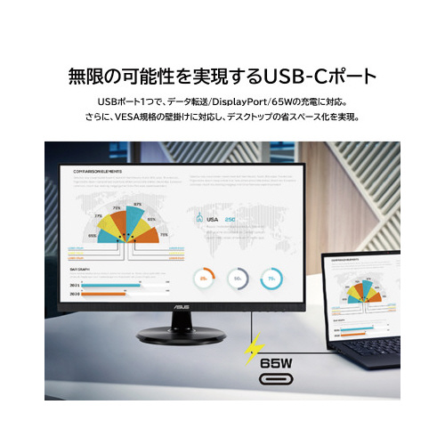 USB-Cポートは、USB-Cケーブル1本でDisplayPort信号での映像伝送と、65Wの電力供給に対応。75HzのリフレッシュレートとAdaptive-Sync/FreeSync技術採用。