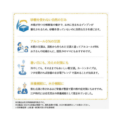 米、米こうじのデンプンを糖化し、自然な甘みを引き出したストレートタイプの糀甘酒です。砂糖不使用、アルコール0%の甘酒で、小さなお子様にも飲みやすく熱中症対策にもおすすめです。