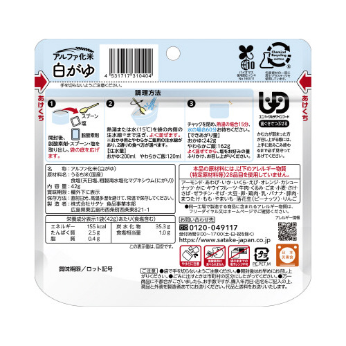 5年間の長期保存が可能。調理時に注水量を変えることによって、おかゆとやわらかご飯の2通りの食べ方が選べ、安定性のある袋がそのまま容器になり、スプーン付きで、どこでもお召し上がりいただけます。