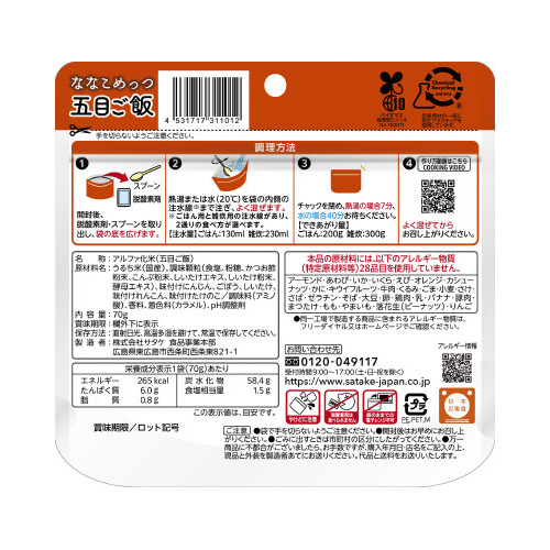 ●原材料名/うるち米(国産)、調味顆粒(食塩、粉糖、かつお節粉末、こんぶ粉末、しいたけエキス、しいたけ粉末、酵母エキス)、味付けにんじん、ごぼう、しいたけ、味付けれんこん、味付けたけのこ/調味料(アミノ酸)、香料、着色料(カラメル)、pH調整剤