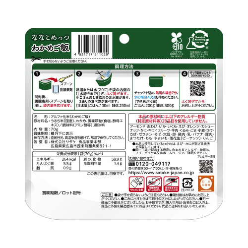 ●原材料名/うるち米(国産)、わかめ、調味顆粒(食塩、酵母エキス)/調味料(アミノ酸等)、酸味料