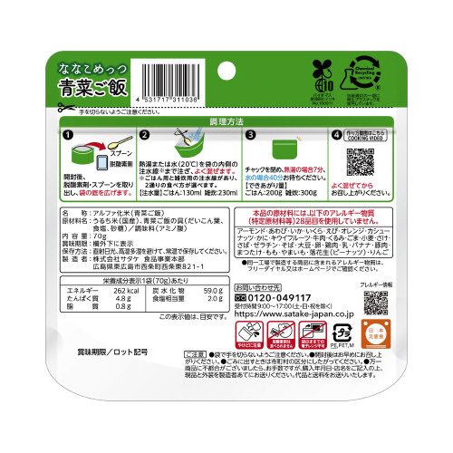●原材料名/うるち米(国産)、青菜ご飯の具(だいこん葉、食塩、砂糖)/調味料(アミノ酸)/調味料(アミノ酸等)、酸味料