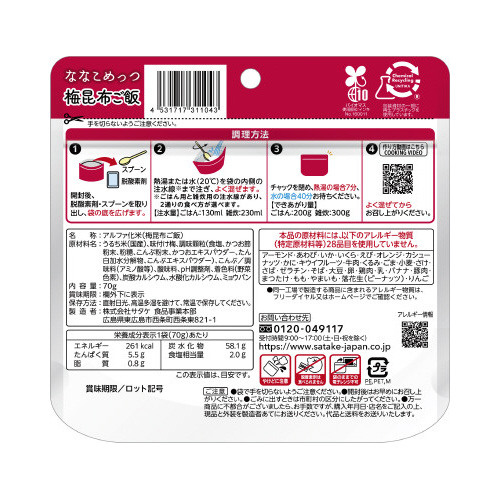 ●原材料名/うるち米(国産)、味付け梅、調味顆粒(食塩、かつお節粉末、粉糖、こんぶ粉末、かつおエキスパウダー、たん白加水分解物、こんぶエキスパウダー)、こんぶ/調味料(アミノ酸等)、酸味料、pH調整剤、着色料(野菜色素)、炭酸カルシウム、水酸化カルシウム、ミョウバン