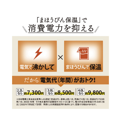 電気で沸かして「まほうびん保温」。905Wスピード沸とう。湯沸かし時間・消費電力量・蒸気を抑える「沸とうセーブ」を選択可能。2時間操作しないと保温ヒーターを自動オフ「省エネモード」を選択可能。