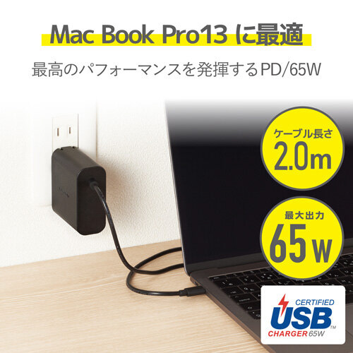 USB-IFのPower Delivery規格正規認証品。 Power Deliveryに対応した機器を超高速充電できる、最大出力65WのPower Delivery対応USB AC充電器。