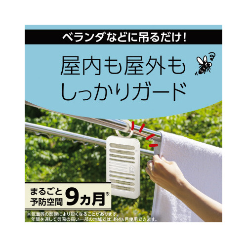 ベランダなどに吊り下げる、蚊よけプレート。出入口付近に設置するだけで、屋内への蚊の侵入を阻止。屋外での忌避効果も。直径約4mの範囲で効果があります。