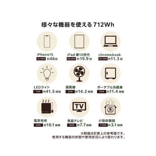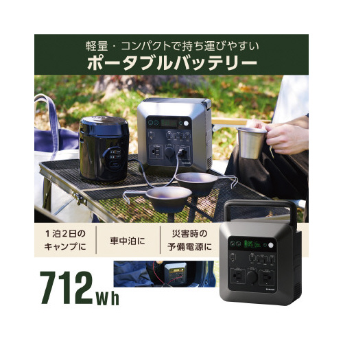 アウトドアで活躍!712WhのAC・DC・USB出力対応ポータブルバッテリー。計4種7ポート搭載。コンパクトで大容量。