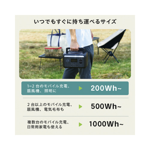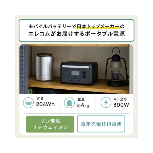 万が一の停電への備えに。AC・DC・USB出力対応の204.8Whポータブル電源。安全性が高く長寿命のリン酸鉄リチウムイオンセル電池採用。