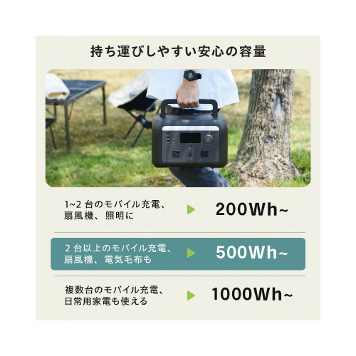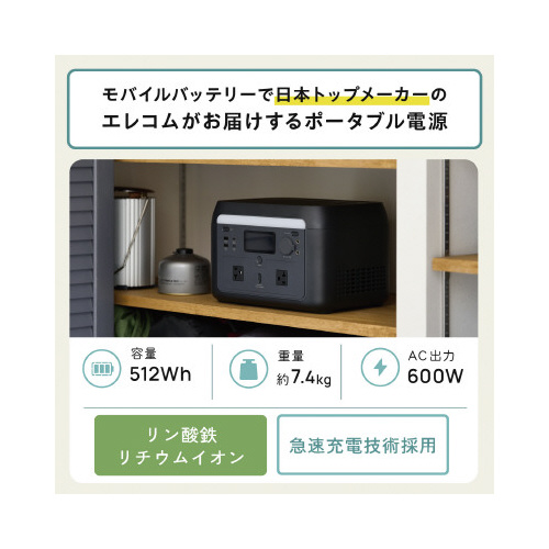 万が一の停電への備えに。AC・DC・USB出力対応の512Whポータブル電源。安全性が高く長寿命のリン酸鉄リチウムイオンセル電池採用。