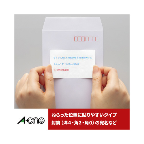 ずらせるから狙った位置に貼りやすい加工を施しています。のり面に独自特殊加工をすることで、封筒上で滑らせて位置合わせがしやすくなっています。いろいろなプリンタで印刷できるラベルシールです。