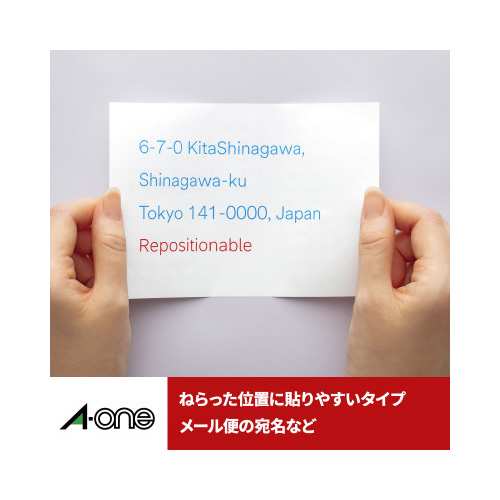 ずらせるから狙った位置に貼りやすい加工を施しています。のり面に独自特殊加工をすることで、封筒上で滑らせて位置合わせがしやすくなっています。いろいろなプリンタで印刷できるラベルシールです。