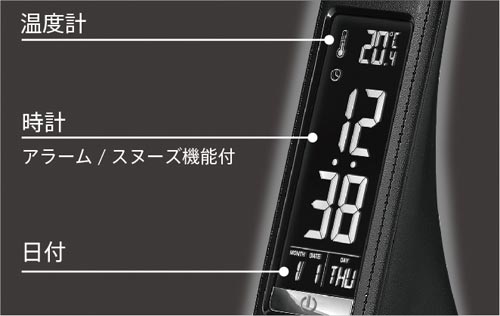 インテリア性のあるレザー調のLEDデスクライト。デジタル液晶表示カレンダー、温度、時間(アラーム、スヌーズ付)。フレキシブルアームで照明角度は自由に調節できます。高性能LED採用。AC/USB対応。