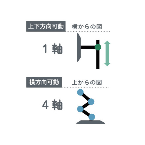 ●可動範囲/モニタ-傾斜:上-85°/下15°、関節軸回転:左90°(3ヶ所)/右90°(3ヶ所)、中心軸回転:左180°/右180°