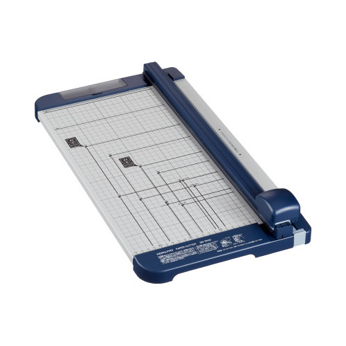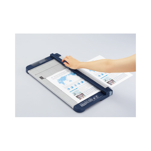 チタン加工刃搭載で、切れ味持続2倍・切れ味110%・刃先の硬度2.5倍(全て当社比)。スライダーを前後にスライドするだけで簡単に裁断ができるロータリー式(裁断能力:PPC用紙10枚)。