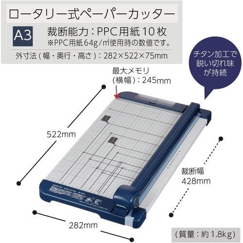 チタン加工刃搭載で、切れ味持続2倍・切れ味110%・刃先の硬度2.5倍(全て当社比)。スライダーを前後にスライドするだけで簡単に裁断ができるロータリー式(裁断能力:PPC用紙10枚)。