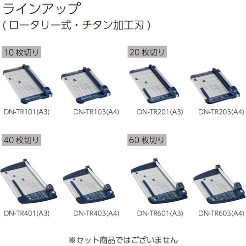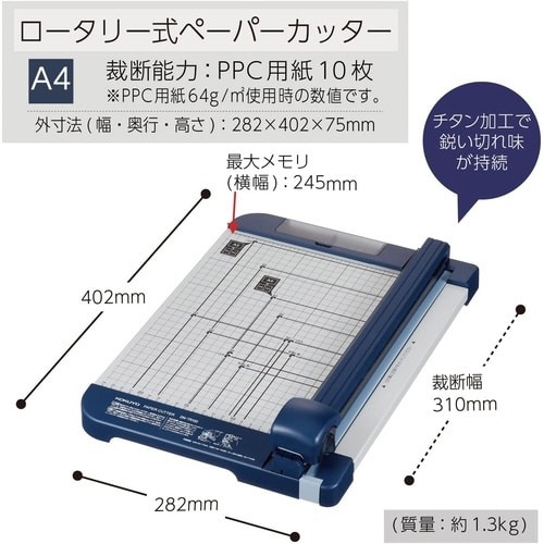 チタン加工刃搭載で、切れ味持続2倍・切れ味110%・刃先の硬度2.5倍(全て当社比)。スライダーを前後にスライドするだけで簡単に裁断ができるロータリー式(裁断能力:PPC用紙10枚)。