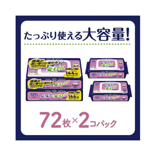排泄臭などの気になるにおいを良い香りに変える、新発想の消臭技術「デオマジック(R)」配合。プラスチックふた付きだから、片手でらくらくシートを取り出せる。素肌と同じ弱酸性だから、お肌にもやさしい。