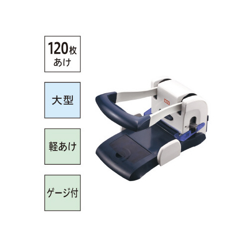 幅140mmのスリムな軽あけ120枚パンチ!紙押さえプレートで用紙がたわまずキレイに穴あけ。穿孔部にあんしんカバーが付いているので刃に誤って触れる事がなく安心。予備用替刃2本+刃受け2枚が付いてお得!