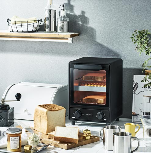 場所を取らないコンパクトな縦型設計の2段式オーブントースター。同時に違うお料理が作れて効率的!高温になるとヒーターが自動で消える、庫内温度調整器付き。