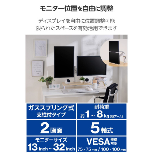 モニターの位置を自由に調整でき、デスクのスペースを有効活用!13から32インチサイズのモニターを2台設置できる、支柱付きのガススプリング式のデュアルモニターアームです。