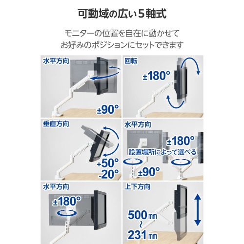 17インチから49インチサイズのモニターに対応する高耐荷重ガススプリング式のカウンターバランス シングルモニターアームです。