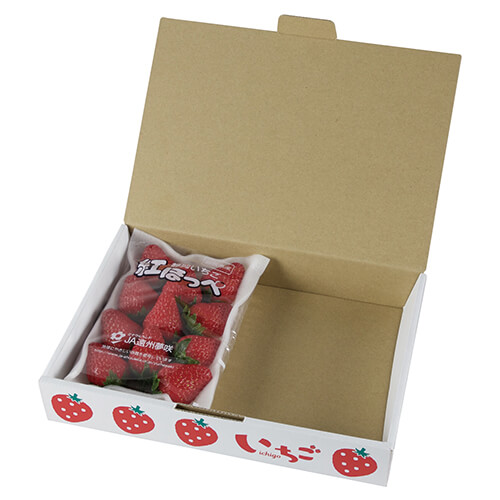 サイズが290×205×60mmのフルーツ用ギフトパッケージ。イチゴ平トレー2パックにちょうど良い大きさとなっています。イチゴのパッケージ、ギフト包装にいかがでしょうか。