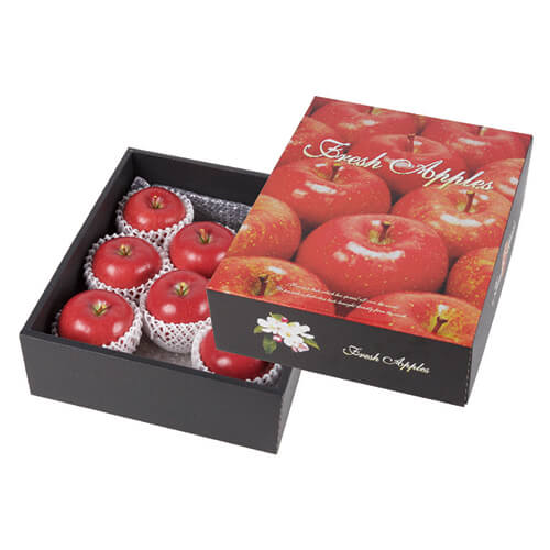 サイズが383×312×110mmのフルーツ用ギフトパッケージ。りんご28玉8個にちょうど良い大きさとなっています。りんごのパッケージ、ギフト包装にいかがでしょうか。