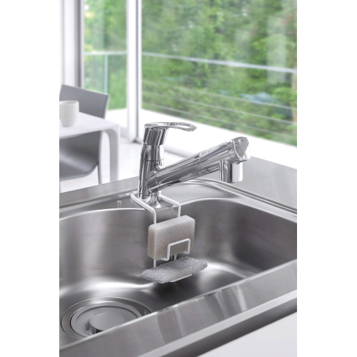 蛇口を挟み込むだけの簡単取り付け。スチールの取り付け部がしっかりホールドするので、ずれ落ちることなく快適に使用できるスポンジホルダーです。シリコンカバー付きで傷つけることがありません。