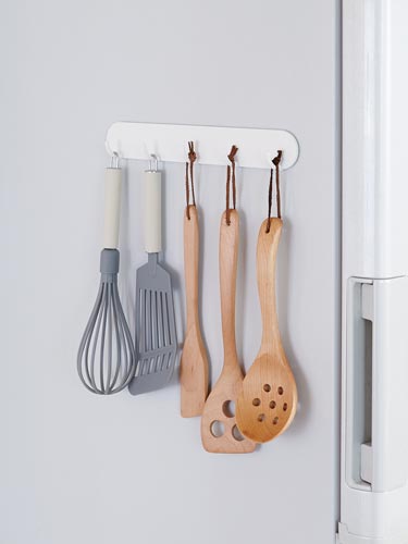 スチール面にぴったり付く、マグネット5連フック。キーホルダー・ストラップなどを掛けるのに便利。